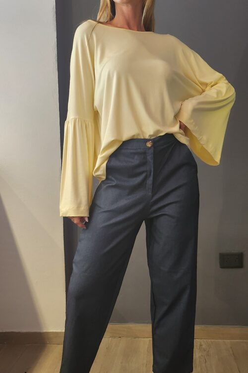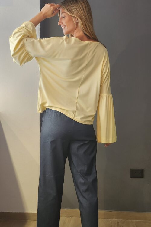 Pantalon confeccionado en bengalina Denim, con corte holgado, cintura elastizada, bolsillos laterales con detalle de alforzas en costura.