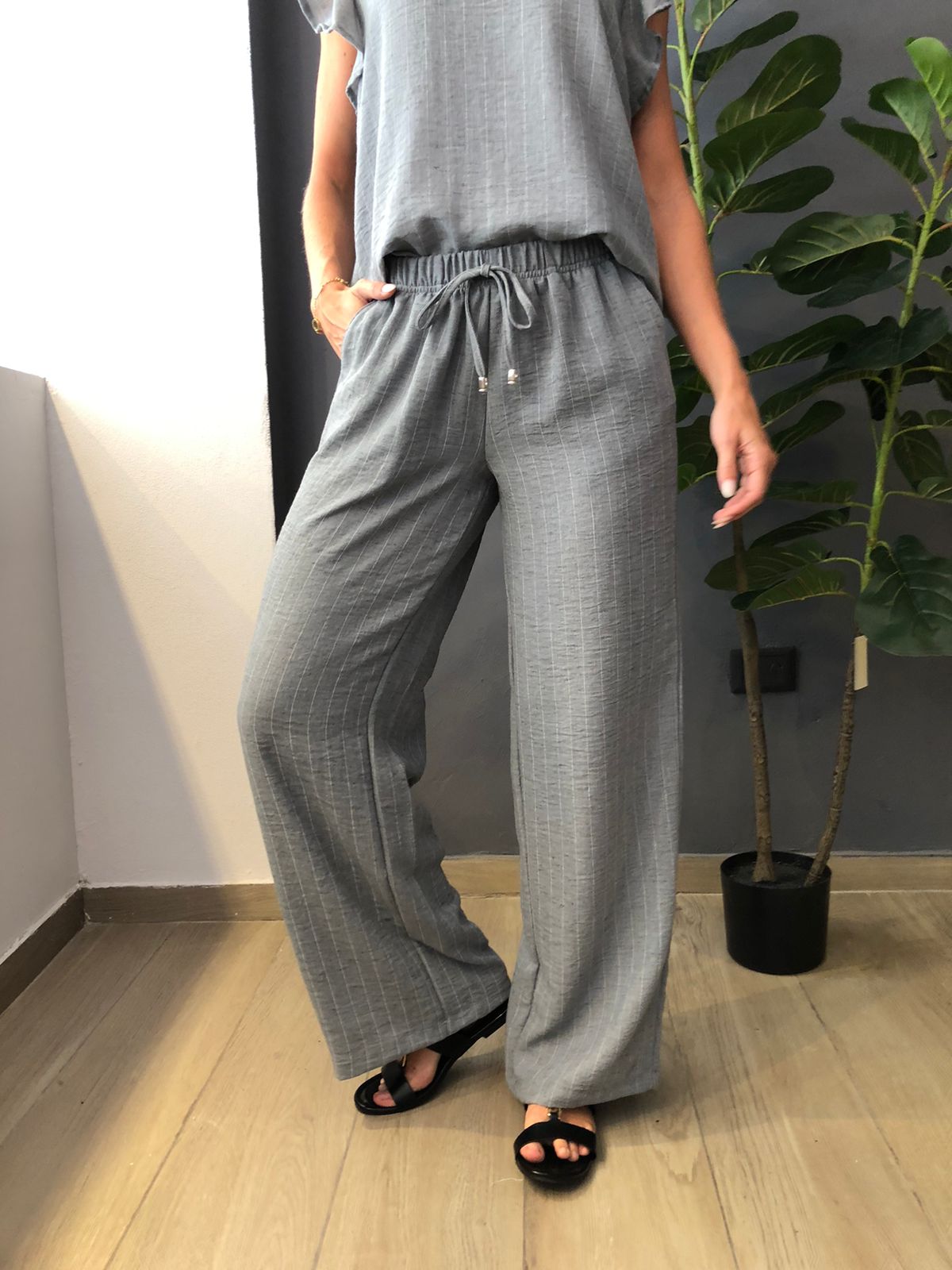 Pantalon piyama recto y ancho confeccionado en lino rayado con bolsillos a los costados con detalle de cordon en frente decorado con terminales Metalizados