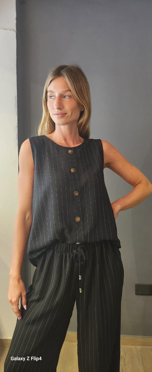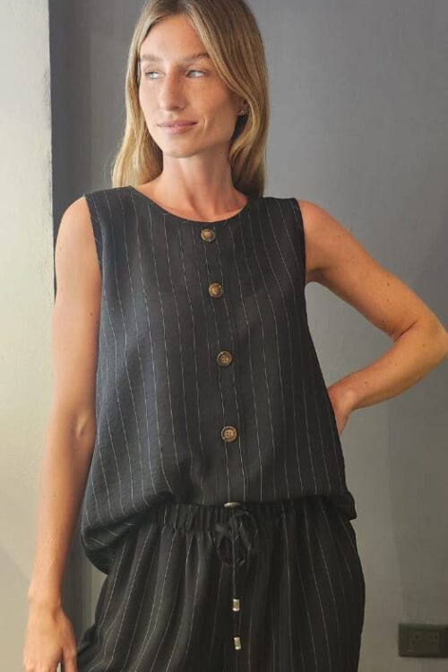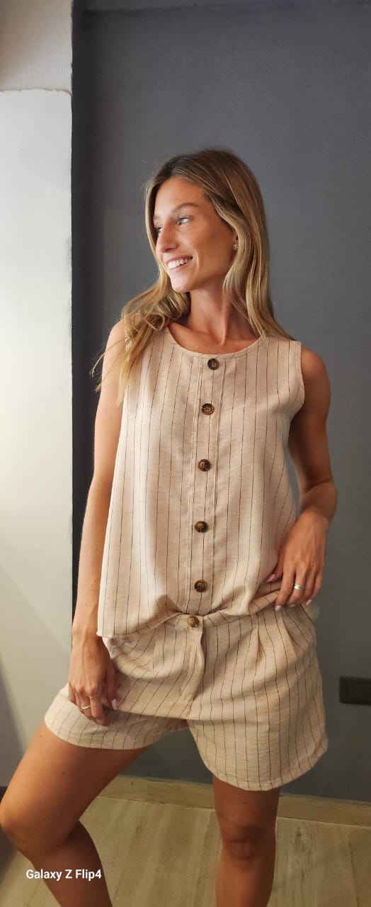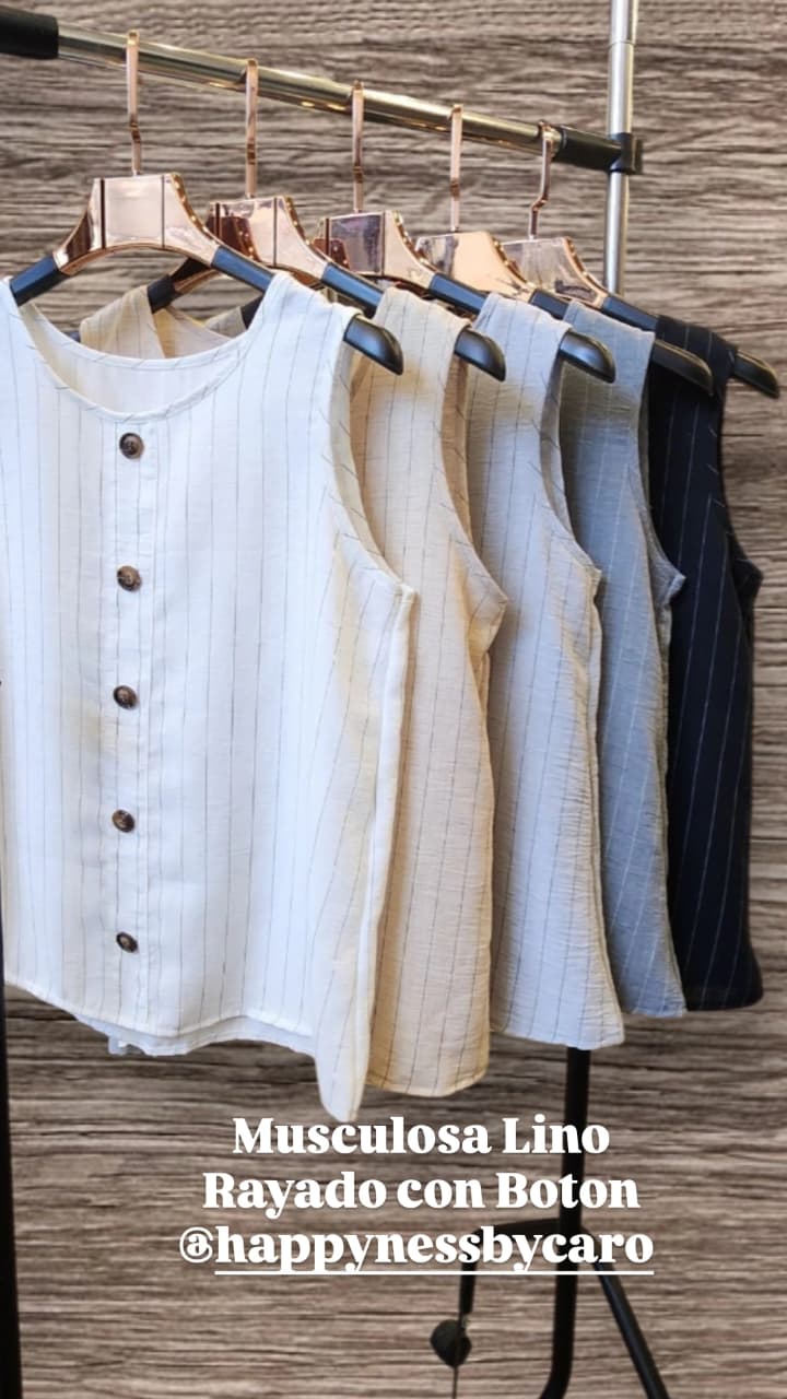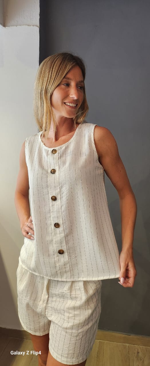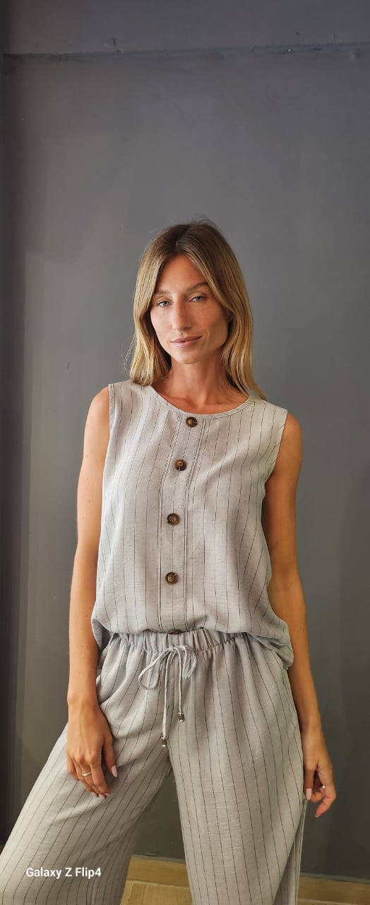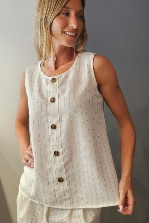 Musculosa amplia con detalle de carteras en el frente y tablas en la espalda confeccionado en lino rayado