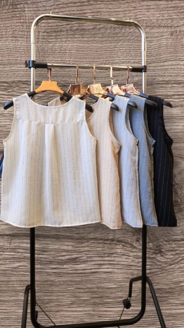 Musculosa amplia con detalle de carteras en el frente y tablas en la espalda confeccionado en lino rayado