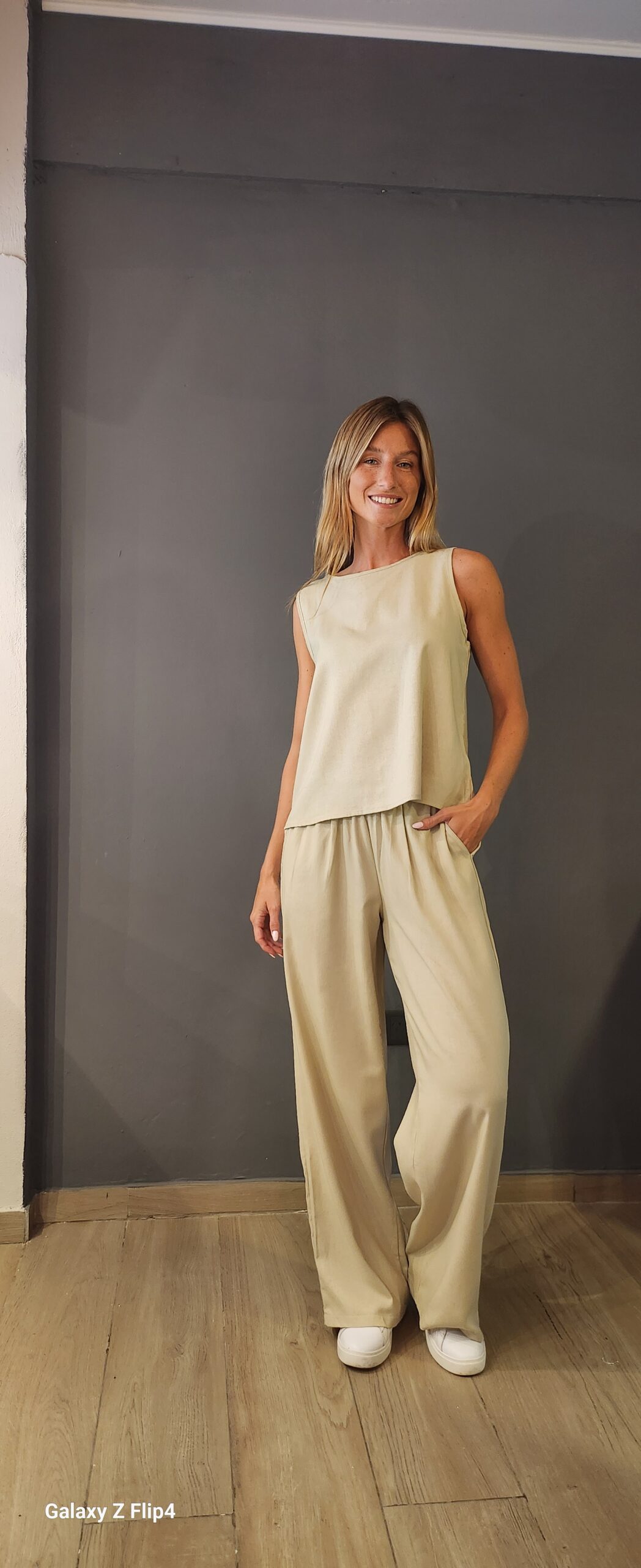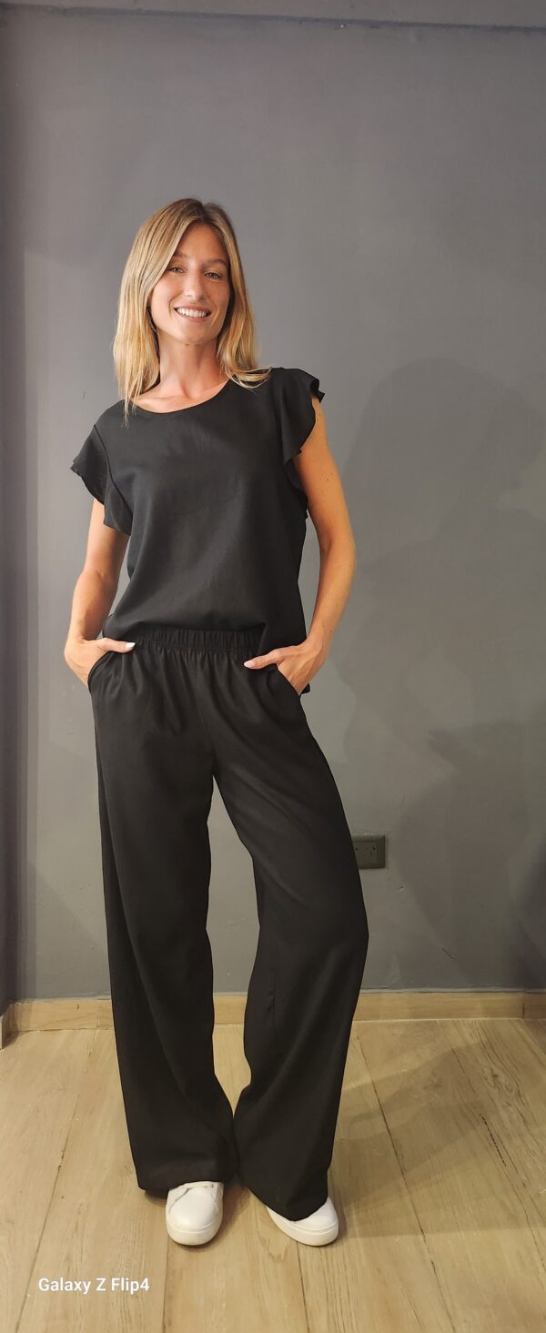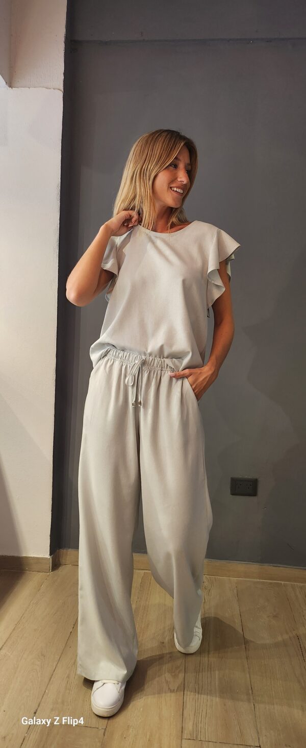 Pantalon piyama recto y ancho confeccionado en lino rayado con bolsillos a los costados con detalle de cordon en frente decorado con terminales Metalizados