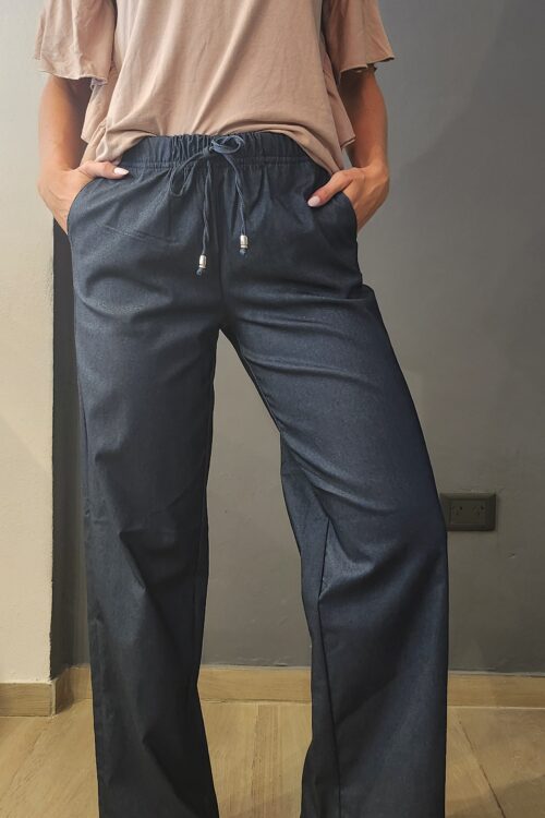 Pantalon palazo con pierna ancho y recto estilo piyama confeccionado en bengalina Denim super elastizado Con bolsillos a los costados cintura elastizada con detalle del cordon con terminales