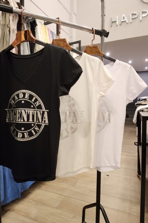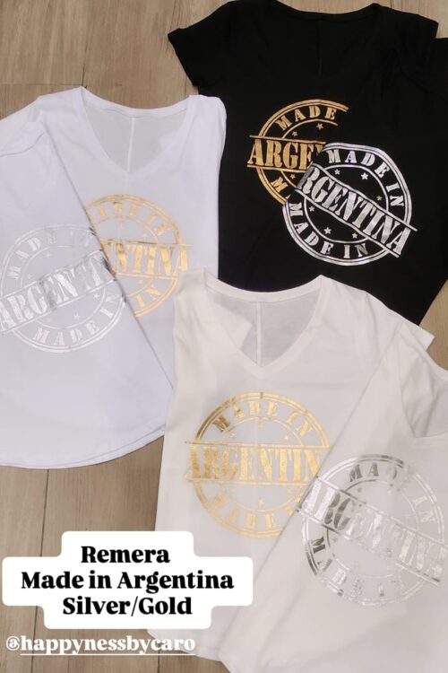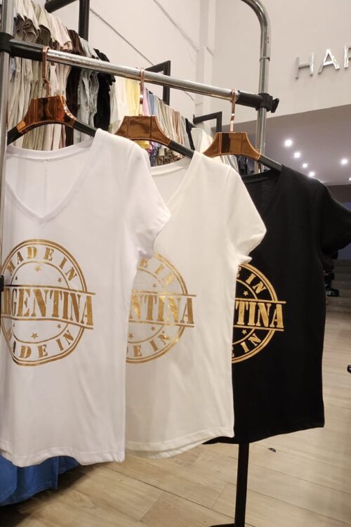 Remera Basica con Escote V con mangas cortas confeccionado en algodon Jersey 30/1 peinado con estampas metalizada con foile dorado y plateado en la delantera con talle unico equivalente al M/L