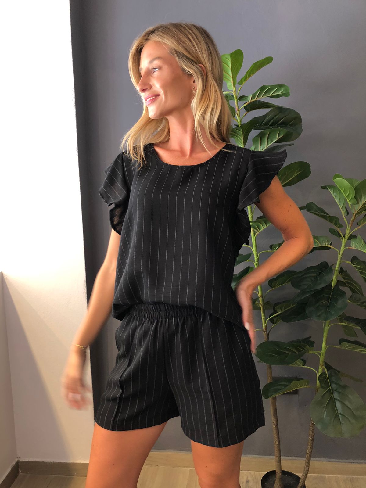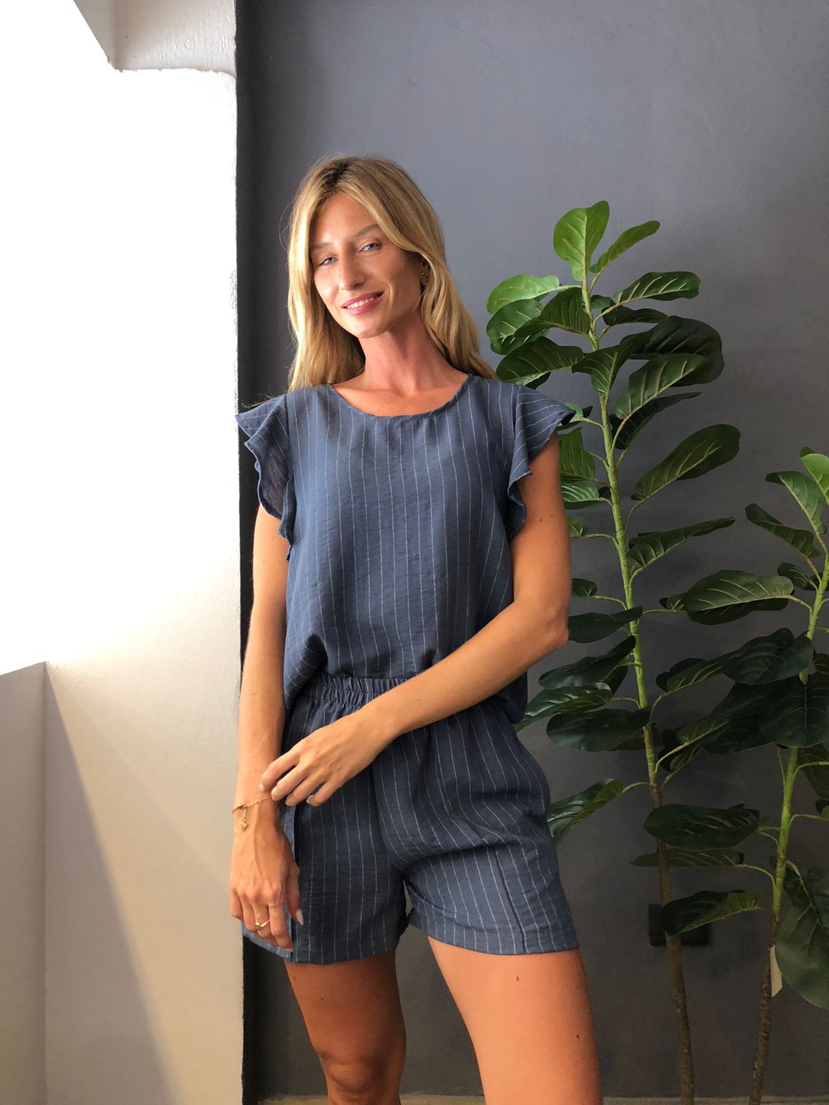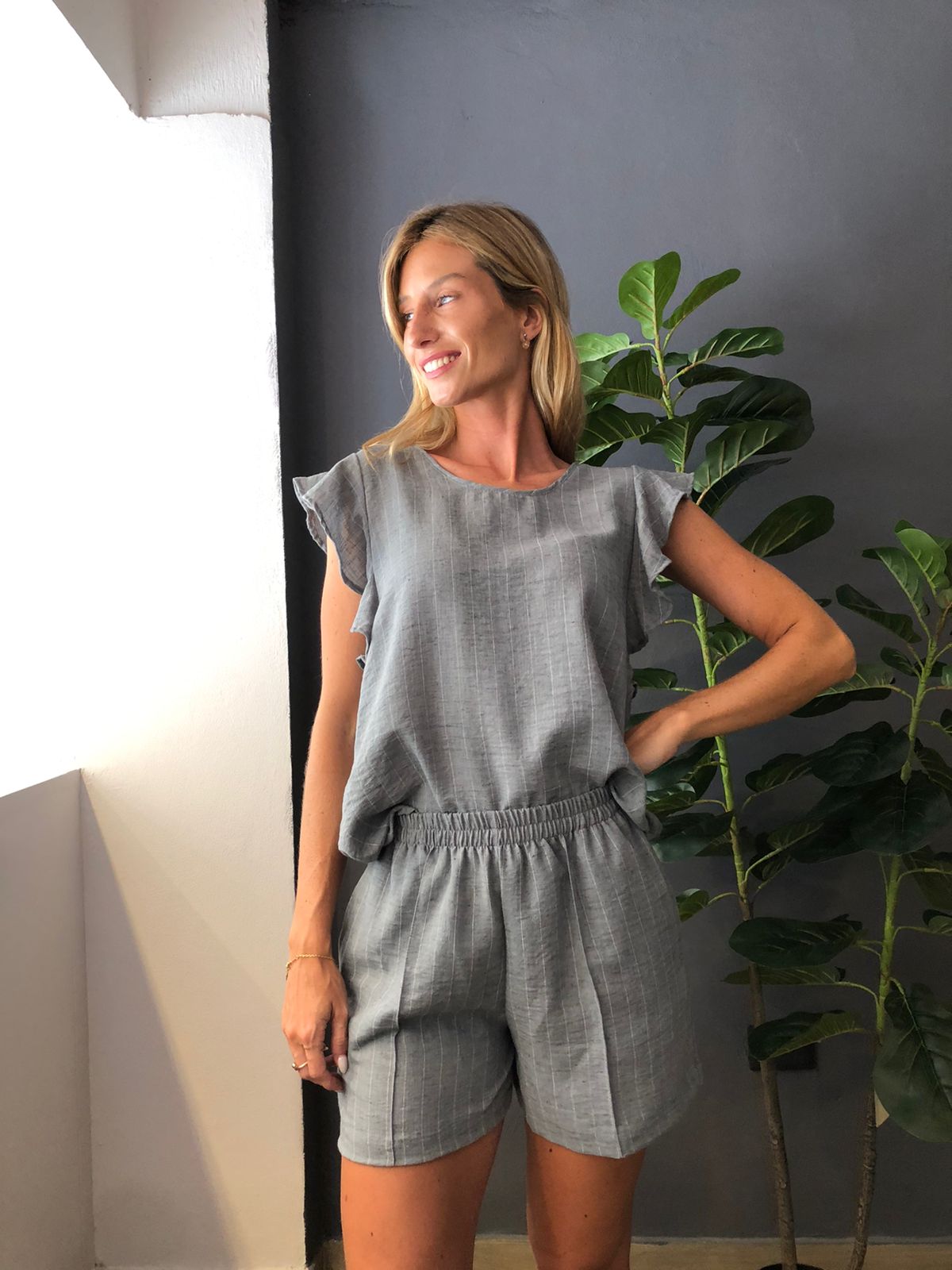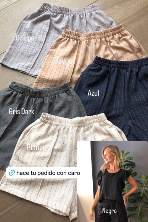 Short confeccionado en Lino rayado, con corte holgado, cintura elastizada, bolsillos laterales con detalle de alforzas en costura.